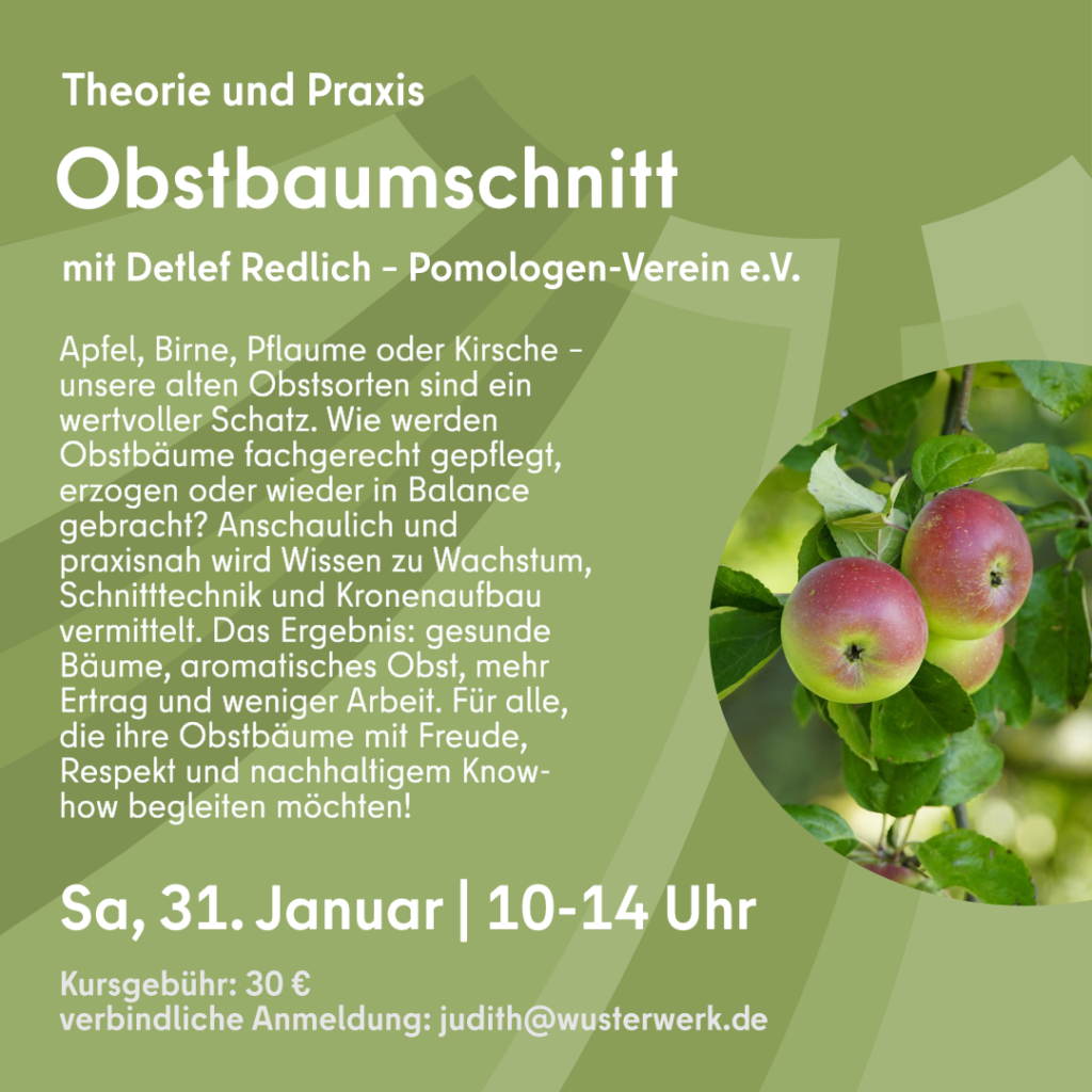 Apfel, Birne, Pflaume oder Kirsche – viele alte und selten gewordene Obstsorten verdienen es, fachgerecht erhalten und genutzt zu werden. In diesem Schnittkurs lernen Sie, wie Obstbäume richtig geschnitten und nachhaltig gepflegt werden. Ziel ist es, junge Bäume von Anfang an korrekt zu erziehen und ältere Bäume vital, gesund und ertragreich zu erhalten. Der Kurs vermittelt praxisnahes Grundwissen zum Obstbaumschnitt, zu Wachstumsgesetzen, Schnitttechnik und harmonischem Kronenaufbau. Sie erfahren, wie gezielte Maßnahmen zu mehr Ertrag, gesünderem Obst und zugleich weniger Pflegeaufwand führen. Der Kurs richtet sich an alle, die Obstbäume kompetent, langfristig und naturnah pflegen möchten.