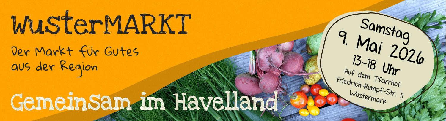 Der WusterMARKT ist ein Kooperationsprojekt von Wusterwerk mit der evangelischen Kirchengemeinde und dem Ernährungsrat Havelland. Der WusterMARKT fand bisher dreimal statt, am 30. April 2022, am 17. September 2022 und am 10. September 2023. Mehr Infos zu den vergangegnen WusterMÄRKTEN hier auf der Seite.